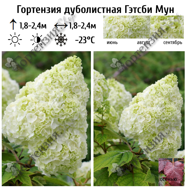 Сорт дуболистной гортензии Gatsby Moon  вывели Дуглас и Бренда Хилл из Кливленда (США).