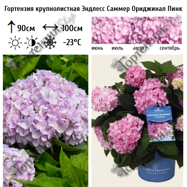 Гортензия крупнолистная Endless Summer ® The Original Pink - первый из сортов гортензии в коллекции. Цветет на одревесневших стеблях прошлого года и на ростках нового сезона. Выносливая, устойчивая к болезням и проверенная временем гортензия. Original может цвести как привлекательная голубая гортензия ИЛИ розовая гортензия, при необходимости регулируя уровень pH почвы. Куст средних размеров – 90-110 сантиметров, с широкой кроной. Стебли прочные, ветвистые с большим количество листвы насыщенного зеленого цвета. Период цветения – июнь-сентябрь. Яркие розовые крупные цветочки собраны в плотные шаровидные соцветия. При обрезке после первого цветения растение зацветет повторно. Сорт желательно располагать на солнце либо полутени, на влажных почвах с хорошим дренажом. На зиму требует укрытия.