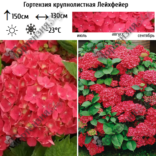Гортензия крупнолистная Лёхтфайер (Hydrangea macrophyllа 'Leuchtfeuer') — компактный, пышный, быстрорастущий сорт с прямостоячими побегами. Цветки крупные, шаровидные, красно-розового цвета, до 20–25 см в диаметре, образуются на концах побегов. Цветет в июле-сентябре. Бесплодные цветки крупные, розовые, с темно-карминовыми мазками до 3,5 см в диаметре. У крупнолистной гортензии плотная ярко-зеленая листва, прошлогодние побеги одревесневшие, текущего года – зеленые, травянистые, древеснеют только в следующем году. Так же как и остальные, крупнолистные гортензии цветут на концах однолетних побегов. Требует укрытия на зиму.