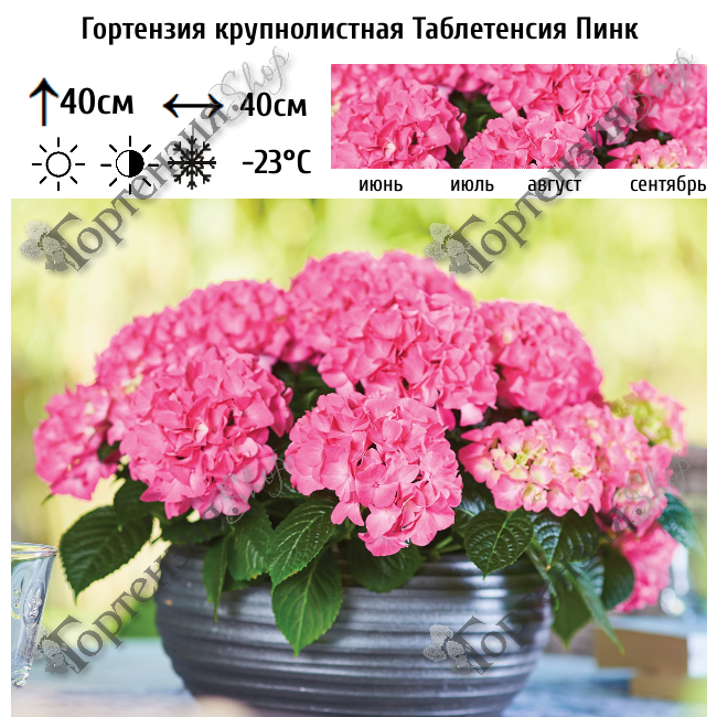 Гортензия крупнолистная «Таблетенсия пинк» (Hydrangea macrophyllа «Tabletensia Pink») высотой 30- 40 см. Единственная в своем роде гортензия — низкорослая, что делает ее идеальной для использования в вазонах. Из-за своего богатого ветвления и богатого цветения, этот сорт выглядит как букет цветов. Период цветения: июнь — сентябрь. Соцветия шаровидные, диаметр — 10–15 см. Диаметр цветков — 2–2,5 см, края лепестков гладкие. Цвет соцветий — сочетание розового, средне-фиолетового и красного оттенков. В зависимости от кислотности почв можно менять окраску цветков: при слабощелочной реакции среды они малиновые, при кислой — сиренево-фиолетовые. Зимостойкость низкая, требуется укрытие до наступления заморозков. Подходит для выращивания в вазонах, кашпо и контейнерах. При посадке лучше всего использовать специальную кислую почву или приготовить собственную почвосмесь из кислого торфа, плодородной почвы и речного песка. Требуется обильный полив. Для уменьшения испарения можно мульчировать сосновой корой или опилками хвойных пород. Предпочитает полутень. На открытом ярком солнце нежные листья и лепестки могут подгорать. Так как это ремонтантный сорт, его не нужно сильно обрезать весной. Достаточно удалить только засохшие соцветия и поврежденные кончики веток до первой пары живых почек, чтобы не лишить растение первой волны цветения.