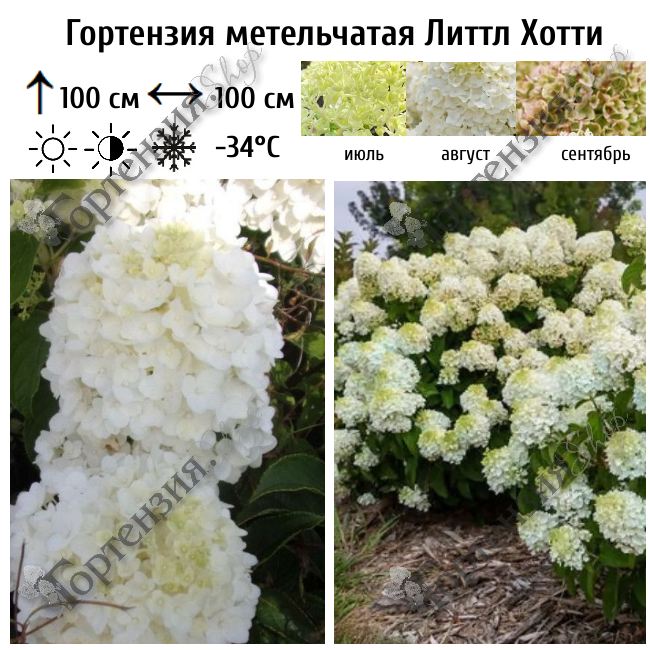 Гортензия метельчатая Литтл Хотти цветущий  кустарник.  Высота куста до 100 см, ширина до 100 см.  Темно-зеленые листья - прекрасный фон для цветов, ветви прямостоящие. Цветет с июля по сентябрь. Цветы в начале цветения зеленые,  затем сливочно-белые.