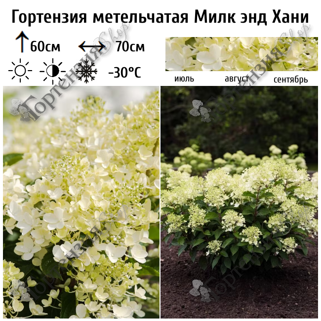 Гортензия метельчатая Милк энд Хоней цветущий карликовый кустарник. Высота куста 60 см, ширина 70 см. Листья зеленые, ветви прямостоящие. Цветет с июля по сентябрь. Цветы меняют цвет от кремового до нежно-розового. Цветочки в соцветии имеют необычный вид, так как расположены на очень длинных черешках, что ещё более усиливает эффект воздушности. Почва должна быть кислая, влажная, но без застоя воды. Зимостойкость -34 С. Используется для миксбордеров, живых изгородей, контейнерного выращивания.