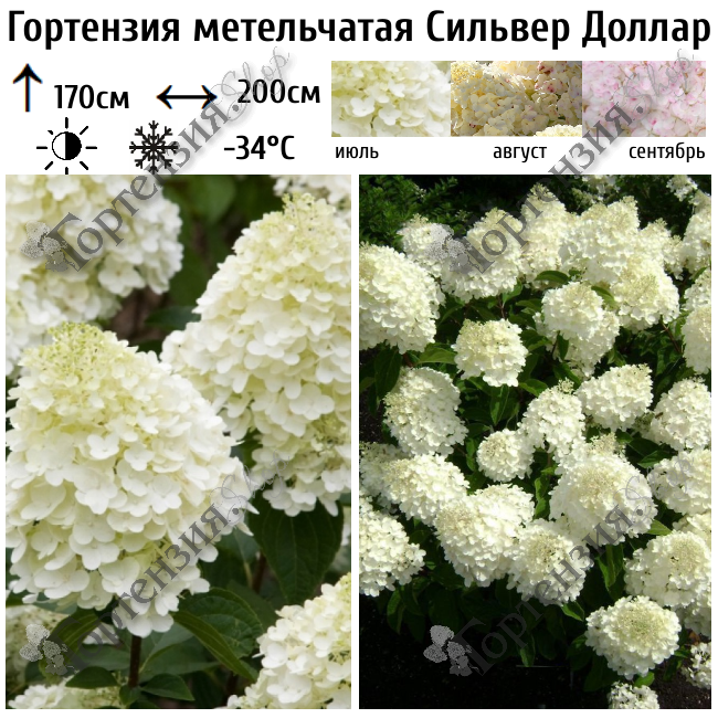 Гортензия метельчатая Сильвер Доллар (Silver Dollar) - высотой до 170 см, и шириной до 200 см. Листья: овальные, слегка заострённые, тёмно-зелёные. Куст с сильными побегами, на которых расположены плотные, округло-конические соцветия. Большинство из цветков в них — стерильны, но есть и часть плодородных. Соцветия: меняются от светло-зелёного до почти чисто белого окраса, становясь серебристо-розовыми в конце лета и начале осени.