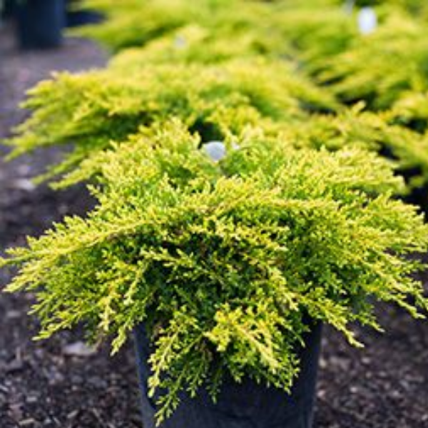 Можжевельник средний Олд Голд (Juniperus x pfitzeriana Old Gold) - один из лучших сортов можжевельника с золотистой листвой. Благодаря яркой окраске и плотной плоской кроне, остается высокодекоративным круглый год. Ежегодный прирост составляет 5-7 см в высоту и 15-20 см в диаметре. В 10-летнем возрасте растение достигает высоты 0,5 м, и ширины 1 м, позже достигает высоты 1,5 м и диаметра кроны до 2,5-3 м. Хвоя золотистая, чешуйчатая, с бронзовым оттенком, не теряет свой цвет в течении всего года