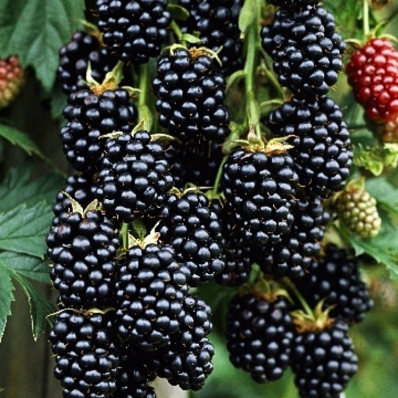 Ежевика Торнфри-  это сильнорослый куст, прямостоящий или стелящийся, не имеет шипов, стебли мощные, разрастается слабо. Высота куста 2,5-3 м. Плодоносить начинает со второй половины июля и до осени. Ягоды 4-5гр, фиолетово-черные, сочные, вкусные, нежные, сладкие с небольшой кислинкой, ароматные, ягодки водянистые не для хранения, не для транспортировки.  Они примерно одинакового размера, слабо опушенные, округло-овальной формы, прочно крепятся к короткой плодоножке. Костянки крупные. Ягоды собраны в большие кисти, по 20-30 шт. в каждой.