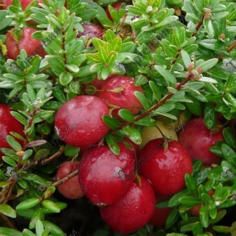 Саженцы Клюквы крупноплодной вырастут в вечнозеленый кустарник с крупными плодами высотой 15-20 см, с раскидистыми или прямостоячими побегами. Раскидистые побеги, простираясь на 1,5-2,0 метра, помогают растению быстро распространяться по земле. Со второго года на них появляются прямостоячие побеги, длиной от 5 до 15 см. На прямых побегах располагаются цветочные почки, обеспечивая обильный урожай. Цветки клюквы самоопыляемые, белые или бело-розовые, с изогнутыми лепестками. Они появляются на опущенных соцветиях, обычно в количестве 6-8 штук, в период с июня по июль. Цветение может продолжаться в течение 20-25 дней.