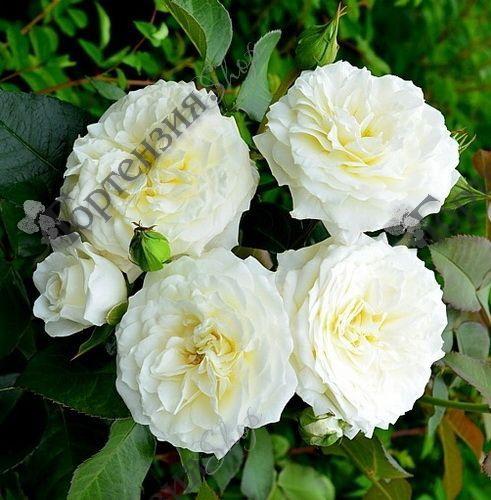 Обильно цветущая роза с крупными густомахровыми кремово-белыми цветками. Куст округлой формы, ветвистый. Цветки появляются в кистях по 3-5 шт, на высоких цветоносах, и прекрасно контрастируют с роскошной, темно-зеленой, блестящей листвой. Высота от 60 до 90 см.