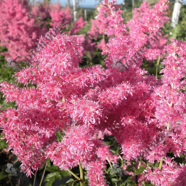 Астильба японская Рейнленд – многолетнее корневищное растение. Высота  50–60 см, диаметр до 60 см. Цветоносы прямостоячие бронзово-розовые. Листья темно-зеленые, блестящие, перистые, с острозубчатым краем. Соцветия – пушистые густые метелки-пирамидки длиной до 25 см из мелких цветков насыщенной розовой окраски. Цветет с конца июня по август.