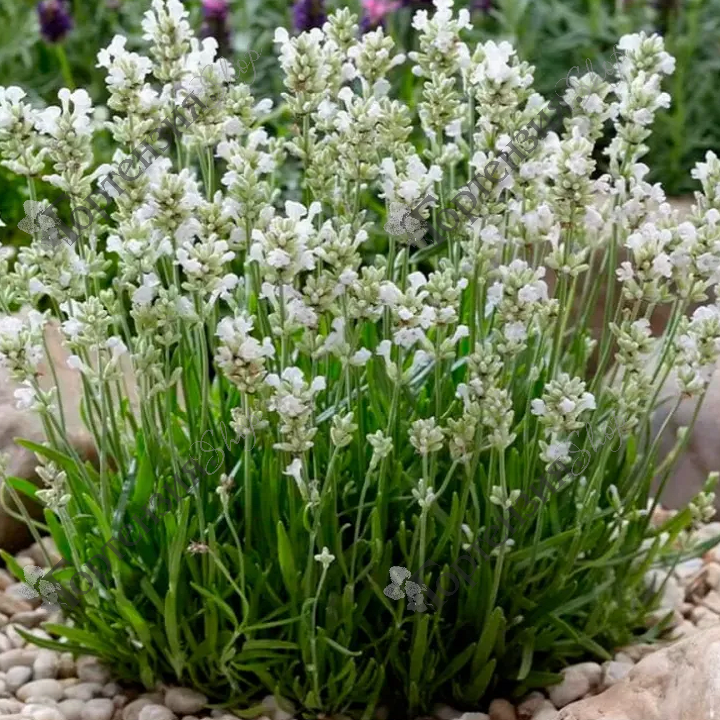 Лаванда узколистная Хидкоте Вайт  (Lavandula angustifolia Hidcote White) – многолетнее растение с многочисленными побегами высотой до 50 см, в нижней части деревянистыми. Цветки небольшие, белые, собраны в прерванные колосовидные соцветия. В сочетании с узкими серебристо-зелеными листьями создают приятный аромат. Обладает полезными свойствами. Цветет в июле - августе. Зимостойкое растение. Прекрасно подходит для посадки в миксбордерах, рокариях, пряных садиках.