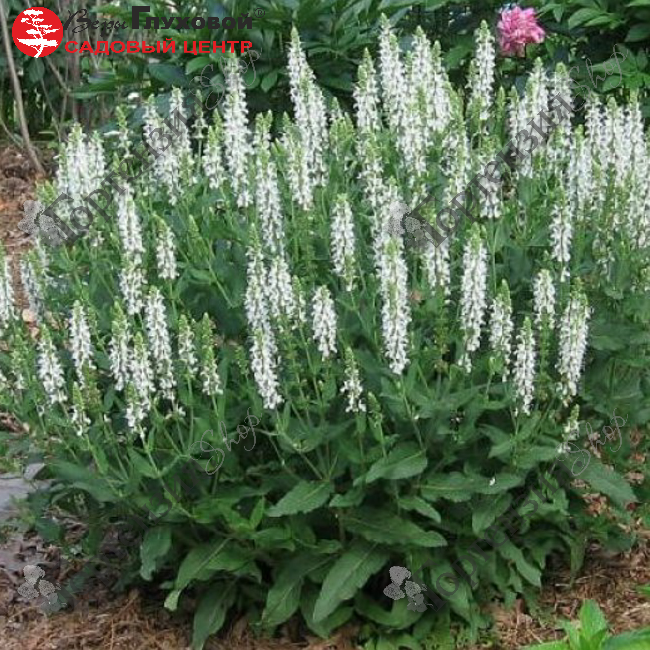 Шалфей дубравный Шнеехугель-травянистый многолетник высотой 50 см, листья крупные, черешчатые, продолговатые, с сердцевидным или округлым основанием, острой верхушкой, городчатые по краю, голые, слегка морщинистые, имеют приятный аромат. Цветки собраны по 2 - 6 в мутовки, мелкие, длиной около 1 см, белые. Цветет с конца июня до начала сентября.Всего несколько кустиков шалфея и на вашем участке все лето будут гостить бабочки.