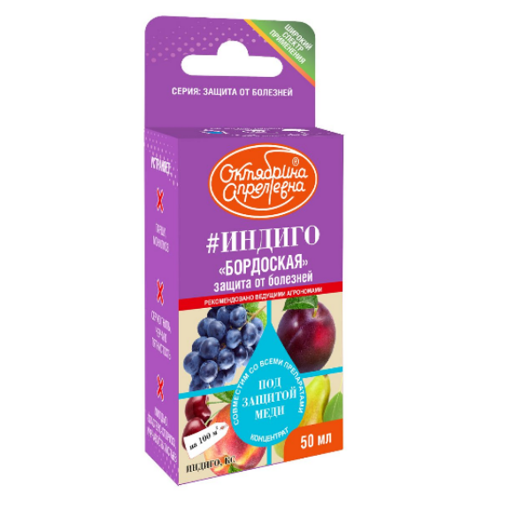 Индиго является контактным фунгицидом и обладает защитными свойствами. Активные составляющие фунгицида - ионы меди - проникают в клетки фитопатогенов, где, взаимодействуя с различными ферментами, подавляют их активность, нарушают процессы дыхания и вызывают неспецифическую денатурацию белков. Это приводит к прекращению роста спор и конидий фитопатогенных грибов и блокировке проникновения их в растение. Препарат характеризуется хорошей прилипаемостью и равномерно покрывает обрабатываемую поверхность. После обработки на растении образуется дождеустойчивый защитный слой, который эффективно подавляет прорастание спор грибов, предотвращая дальнейшее развитие и распространение возбудителей болезней и обеспечивая надежную защиту даже при неблагоприятных погодных условиях.